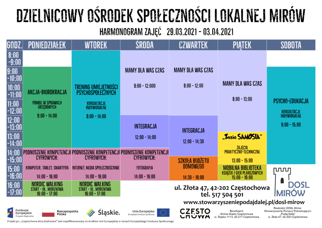 Zadanie publiczne jest współfinansowane ze środków Regionalnego Programu Operacyjnego Województwa Śląskiego na lata 2014-2020 (Europejski Fundusz Społeczny), oś priorytetowa: IX Włączenie społeczne, działanie: 9.1 Aktywna integracja, poddziałanie: 9.1.2 Wzmacnianie potencjału społeczno- zawodowego społeczności lokalnych – RIT Subregion Północny oraz budżetu Gminy Miasta Częstochowy Zadanie „Dzielnicowy Ośrodek Społeczności Lokalnej – Mirów” zostało powierzone do realizacji przez Gminę Miasto Częstochowa w ramach projektu „Częstochowa silna dzielnicami”