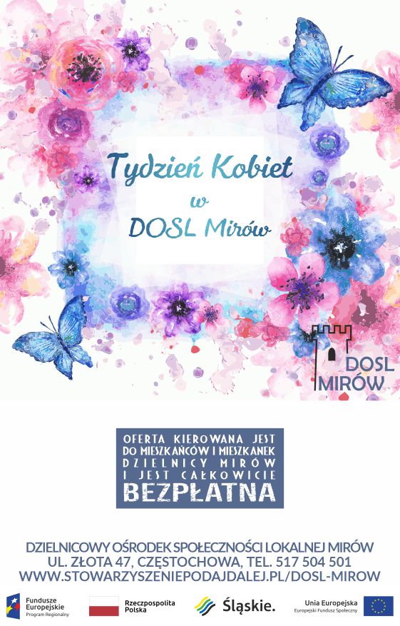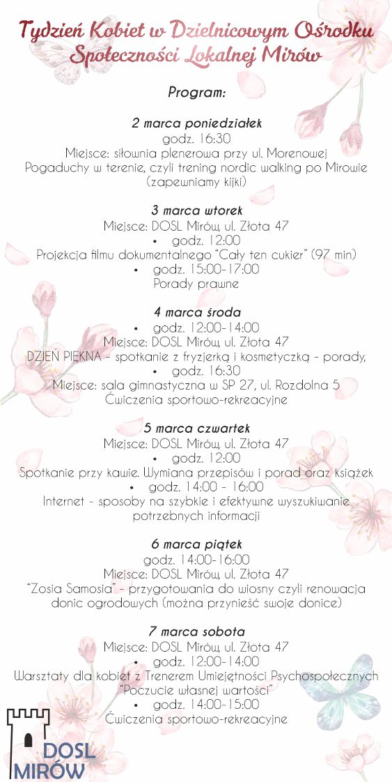 Szanowne Panie! Zapraszamy Was na bezpłatne zajęcia i spotkania przez CAŁY TYDZIEŃ KOBIET do Dzielnicowego Ośrodka Społeczności Lokalnej Mirów.